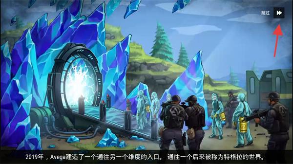 1、游戏开局会播放维度入口的剧情过场,右上角有跳过按钮,点击可快速进入游戏,开启在特格拉世界的生存挑战。