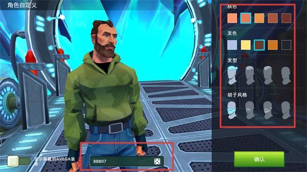 2、进入角色自定义界面,可调整肤色、发色、发型、胡子风格,界面下方显示BBBD07编号,自定义完成后点击确认进入游戏。