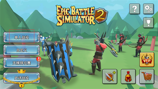 1、进入游戏主界面,可选择单人战役自定义天梯排位赛等模式,还有武器头盔商店等功能按钮,选定对应模式后,即可开启这场融合多样兵种的战争策略挑战。