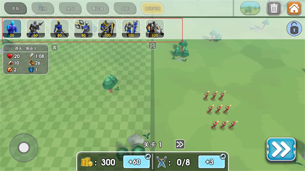 2、进入部署界面,上方陈列多种可选用的兵种,界面同步显示当前资源数量与关卡1标识,按需挑选合适兵种,准备将兵力布置到战场,为后续对战做准备。