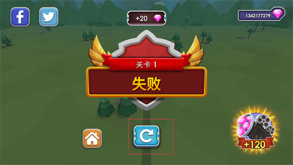 4、若关卡挑战失败,界面会显示关卡1失败的提示,点击下方重新开始按钮,即可重新进入部署界面,调整兵种配置后再次挑战该关卡积累经验。