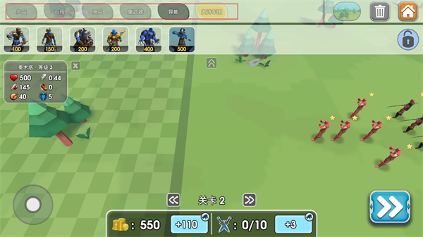 1、进入关卡2部署界面,可选择多种兵种,根据资源和敌方配置布置,准备开启这场策略对战。