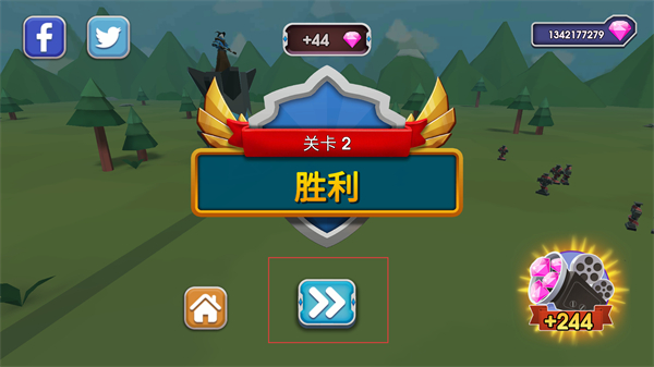 4、关卡2胜利后,界面显示奖励,点击继续按钮,可进入下一关,积累资源解锁更多兵种和防御塔。