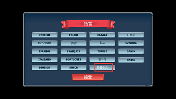 1、在语言选择界面选中繁體中文选项,点击接受按钮,将游戏语言切换为繁体中文,方便后续操作。