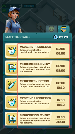 1、进入员工时间表界面,看到MEDICINE PRODUCTION等多项工作的时段安排,按对应时间节点推进医疗相关工作,保障医院的药品供应与诊疗节奏。