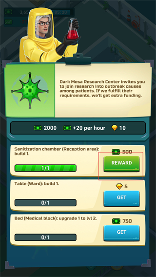 2、看到Dark Mesa Research Center的邀请提示,界面显示设施建造进度及资源消耗,点击REWARD按钮领取奖励,推进医院设施的建设与升级进程。