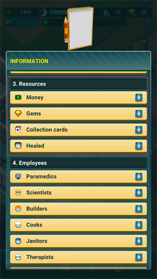 3、进入INFORMATION界面,可查看MoneyGems等资源信息,以及ParamedicsScientists等员工类型,了解医院当前的资源储备与人员配置情况。
