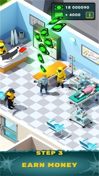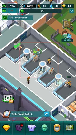 4、处于医院场景中,看到多个医疗设施及忙碌的员工,留意NEW INFECTED提示,安排员工运作设施,接收处理新感染病患,维持医院正常运转。