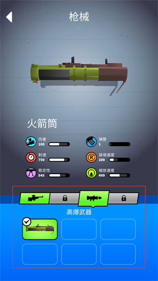 2、进入枪械界面,可查看火箭筒的各项属性,下方设有高爆武器相关选项,部分武器选项处于锁定状态,需满足条件才能解锁使用。