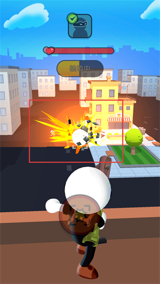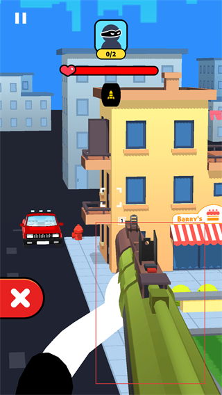 3、切换至火箭筒武器,瞄准下方城市场景里的目标,界面显示剩余暴徒数量及血条,左侧设有关闭按钮,正处于瞄准准备阶段。