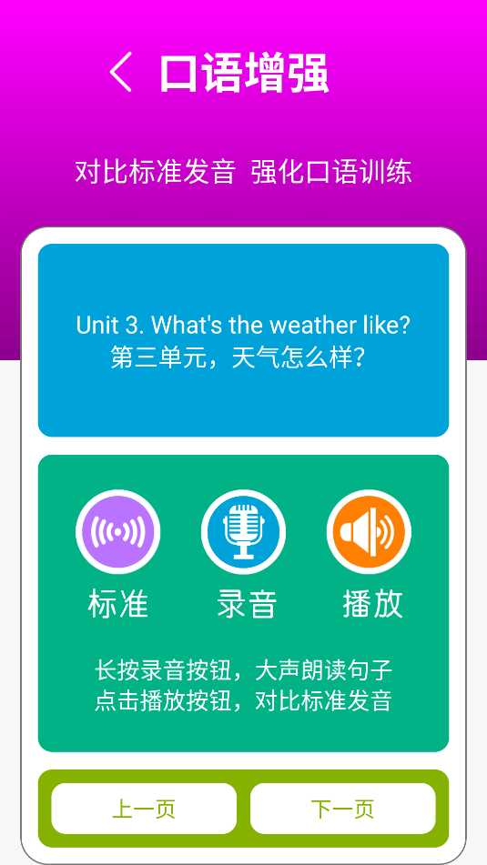 3、下方有三个按钮,点击标准可对上方的单词进行语音朗读,点击录音录入自己发音,点击播放与标准发音进行对比。