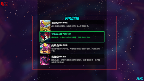 2、在难度选择界面挑选冒险级难度,该难度适合大多数玩家,点击继续进入后续步骤。