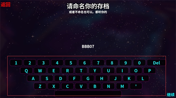 3、在存档命名界面输入BBB07作为存档名称,完成命名后点击继续,推进游戏进程。