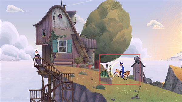 2、操纵场景地形,让骑单车的邮差靠近老者所在区域,为后续的互动剧情铺垫条件。