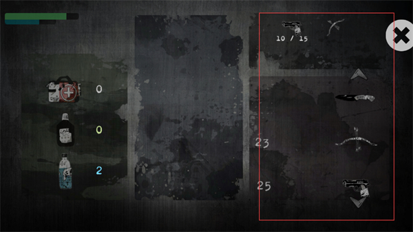 2、打开物品栏界面,查看当前拥有的物资与武器,确认手枪等装备的数量,为后续行动做规划。