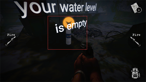 3、看到your water level is empty的提示,拿起地上的水瓶,补充水分来恢复自身的生存状态。
