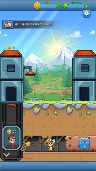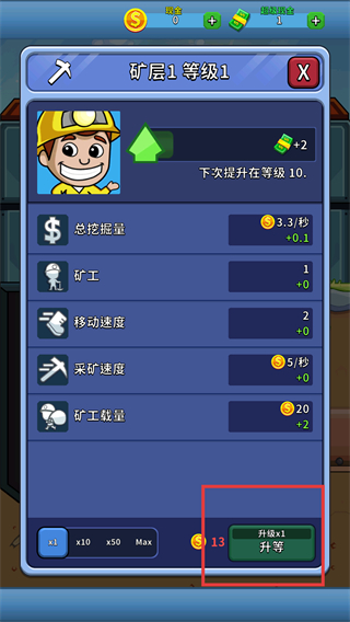 1、点击升级按钮,消耗金币提升矿层等级,同步增强矿工的挖掘量、移动速度等属性,提升采矿效率。
