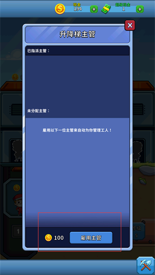 4、点击雇用主管按钮,消耗金币解锁升降梯主管,借助其自动管理功能,优化矿场的资源运输流程。