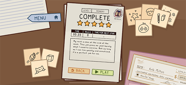 2、七关主题设计,对应七天夜班,场景涵盖不同办公区域,最后一关触发猎人追击机制。