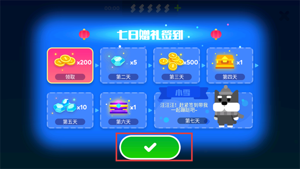 1、先点击领取按钮获取首日签到奖励,再点击绿色对勾按钮关闭七日赠礼界面,继续游戏流程。