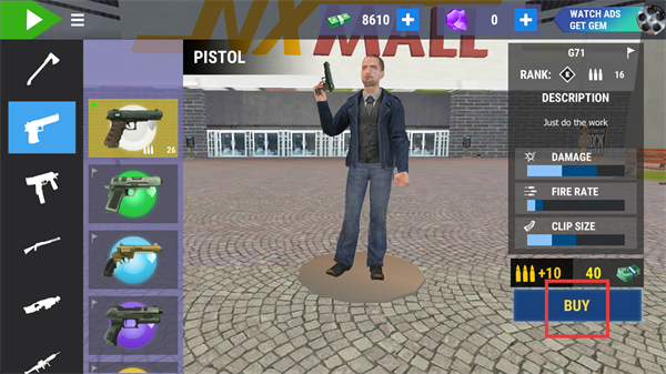 1、进入武器界面选择PISTOL类型,查看其属性后点击BUY按钮,消耗对应的资源购买该手枪,获取武器道具。