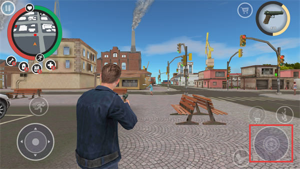 3、操控装备手枪的角色移动,点击右侧的射击按钮,使用手枪攻击目标,触发武器的攻击效果。