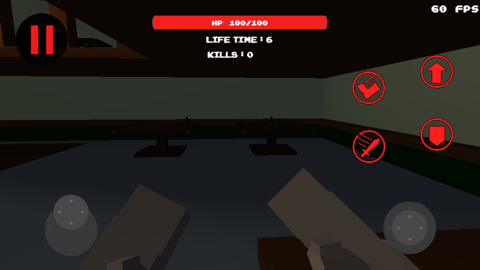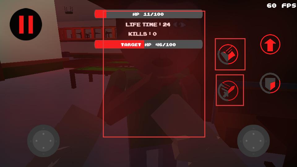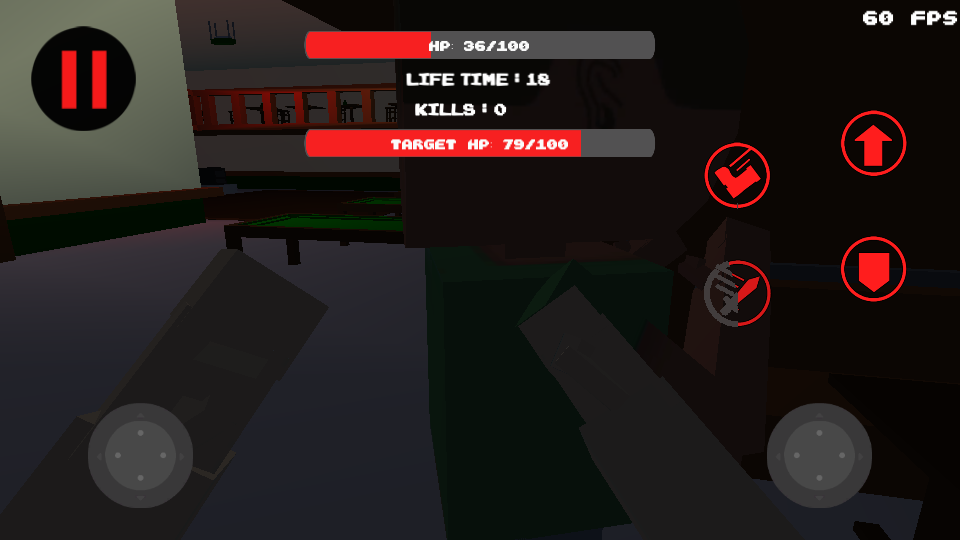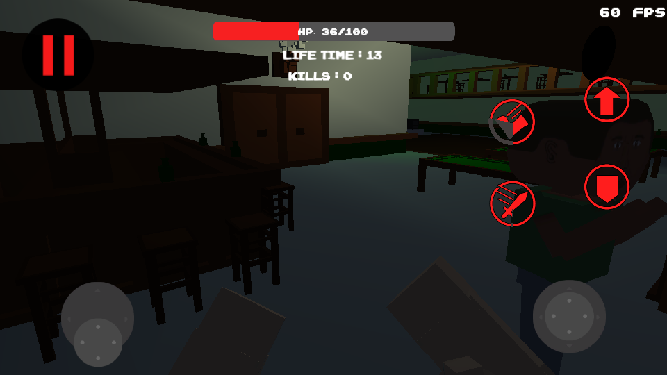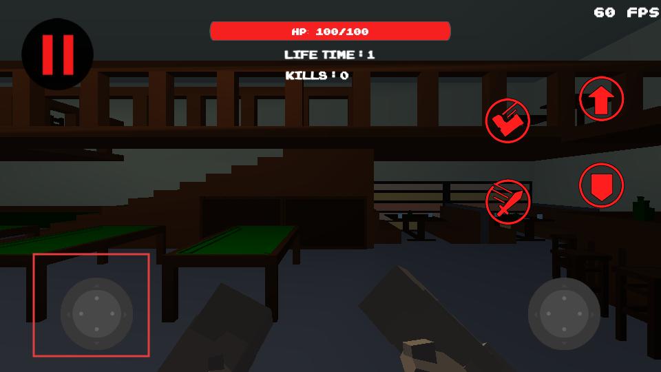 2、在类似台球室的场景里可通过左侧摇杆移动,右侧有攻击、上移、防御等按钮,同时留意上方HP、LIFE TIME、KILLS等状态,应对潜在危险。