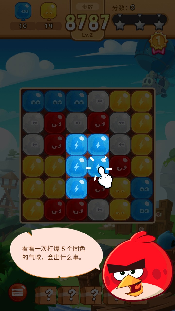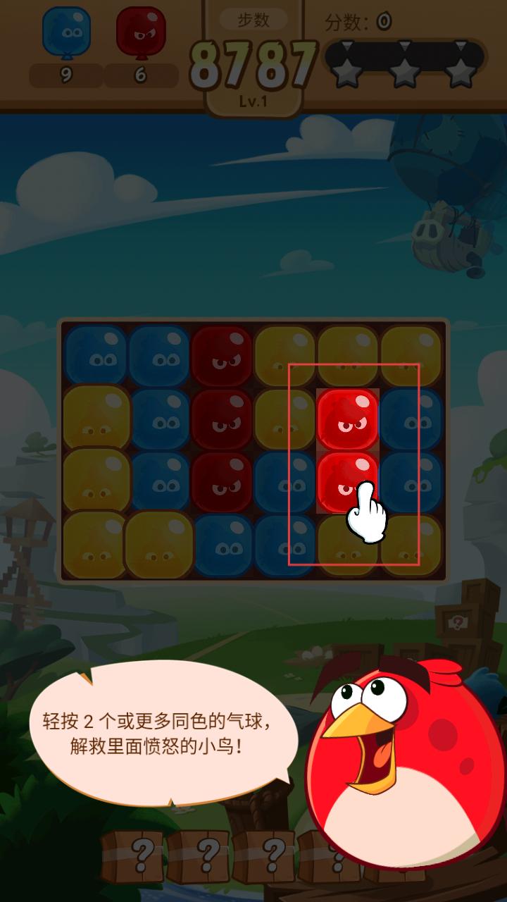 2、游戏中需轻按2个或更多同色的气球,以此解救里面愤怒的小鸟,完成消除目标。