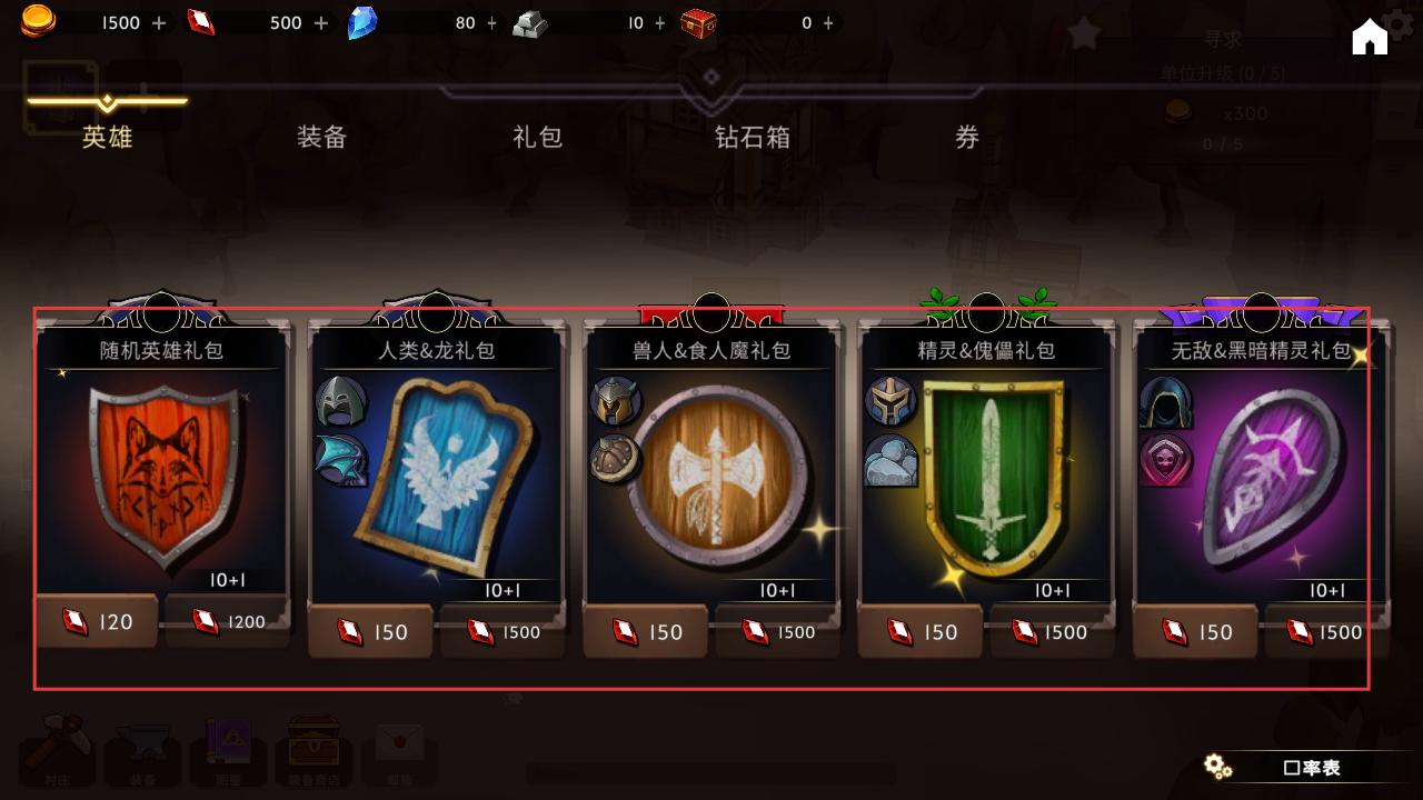 4、在商店选择随机英雄礼包、人类,龙礼包等不同礼包,获取英雄,深度培养英雄,增强王国的战斗与发展实力。