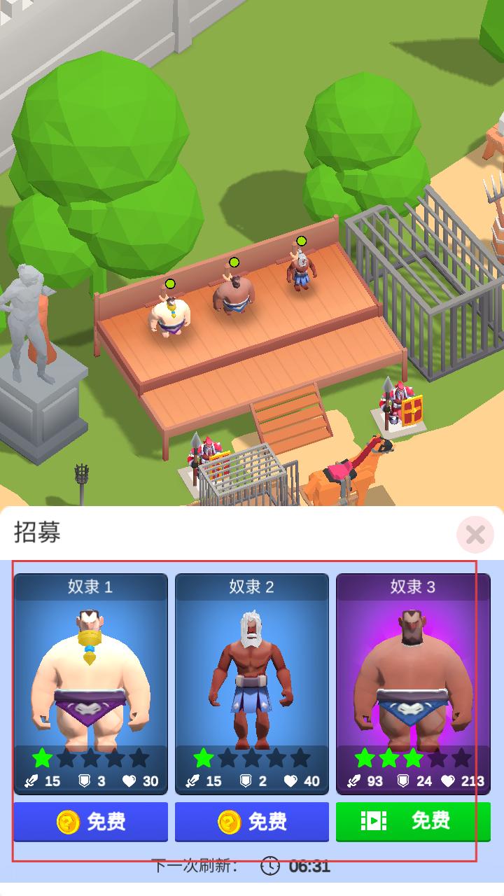 2、可招募不同星级的奴隶作为角斗士,如奴隶1、奴隶2、奴隶3等,通过招募组建角斗士队伍。