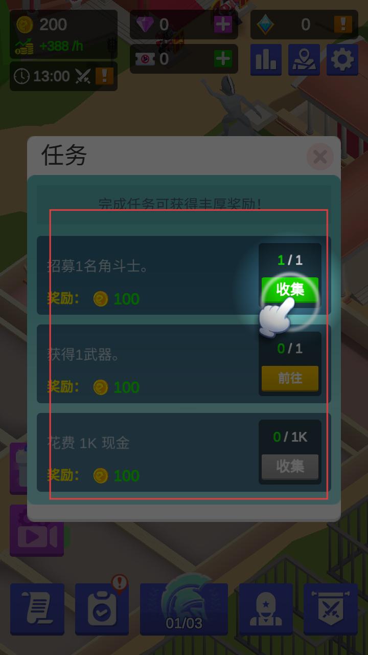 4、完成招募角斗士等任务后,点击收集可获得金币奖励,利用奖励提升竞技场实力。
