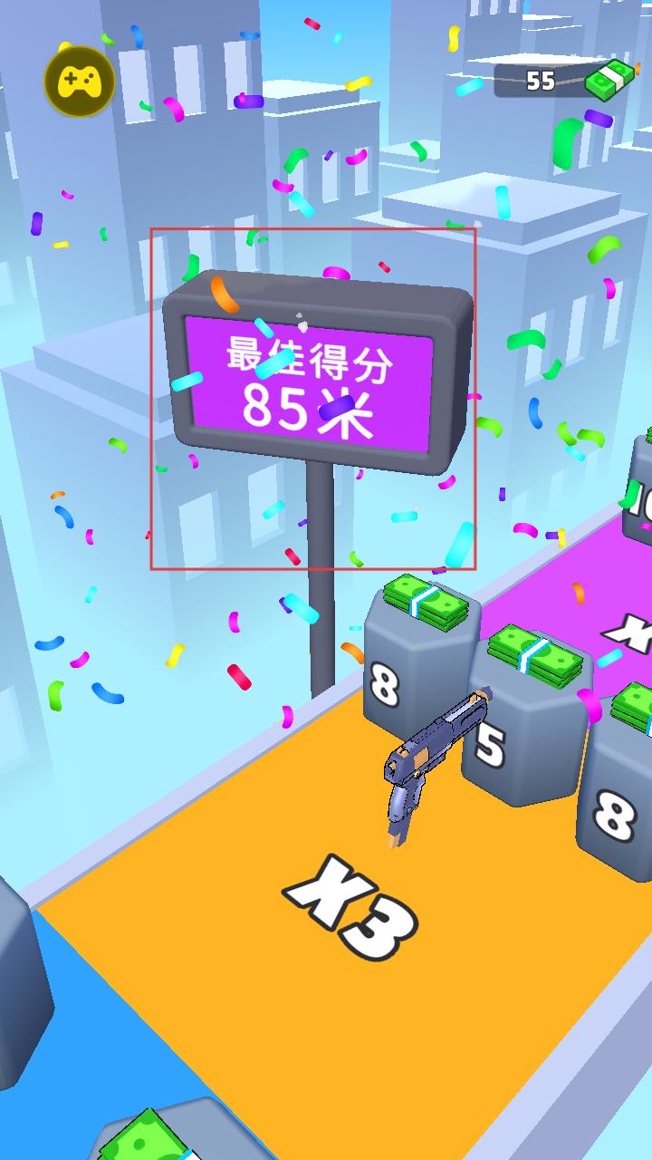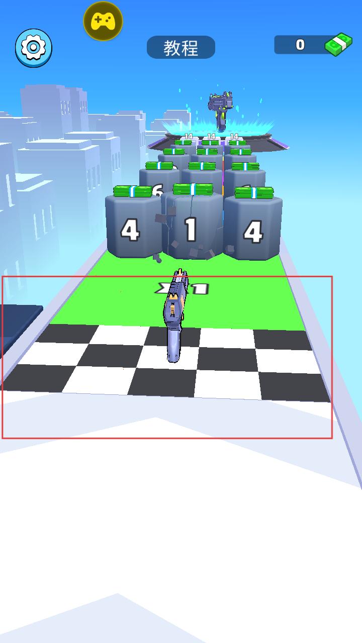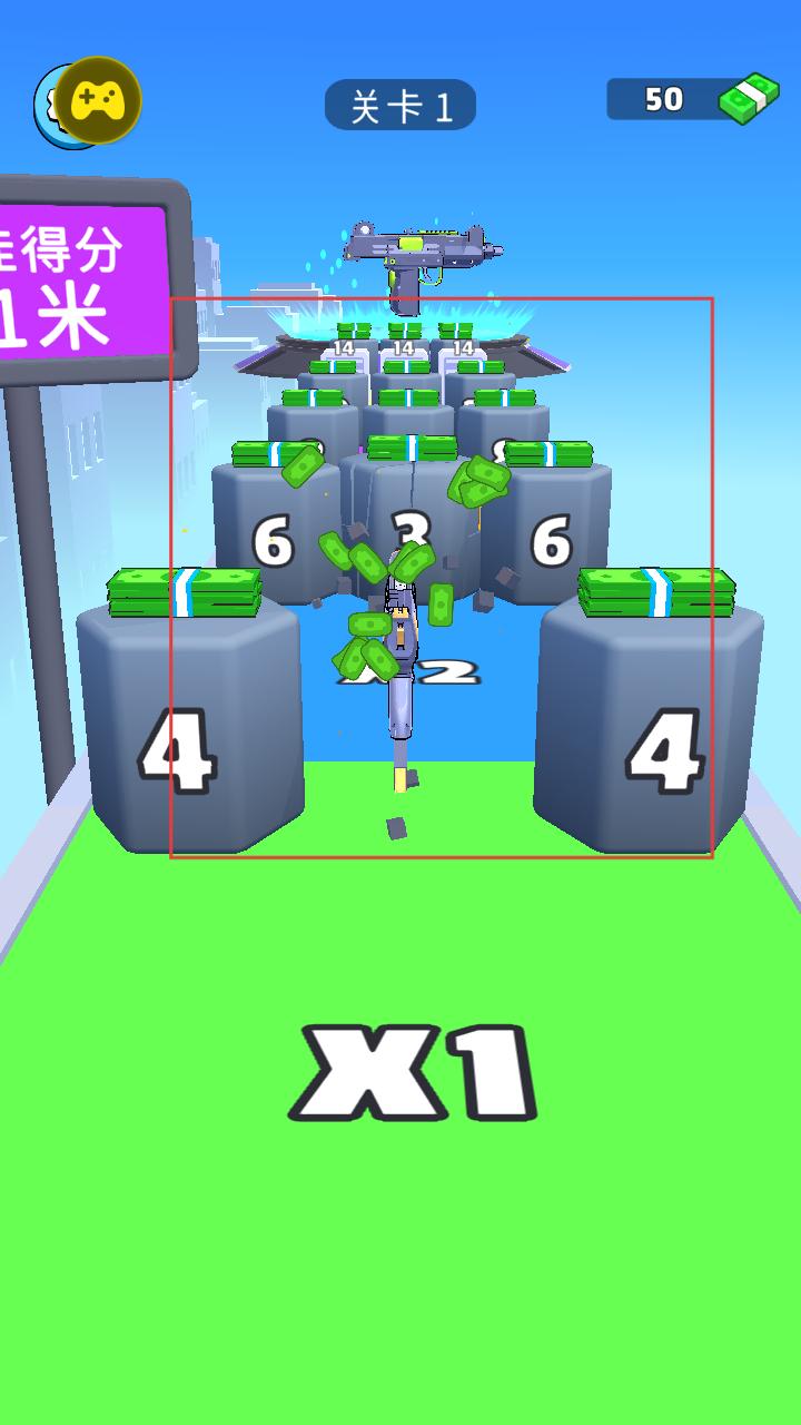 2、在关卡内操控枪械移动,射击带有数字的石块,收集钞票,积累资源用于枪械升级。