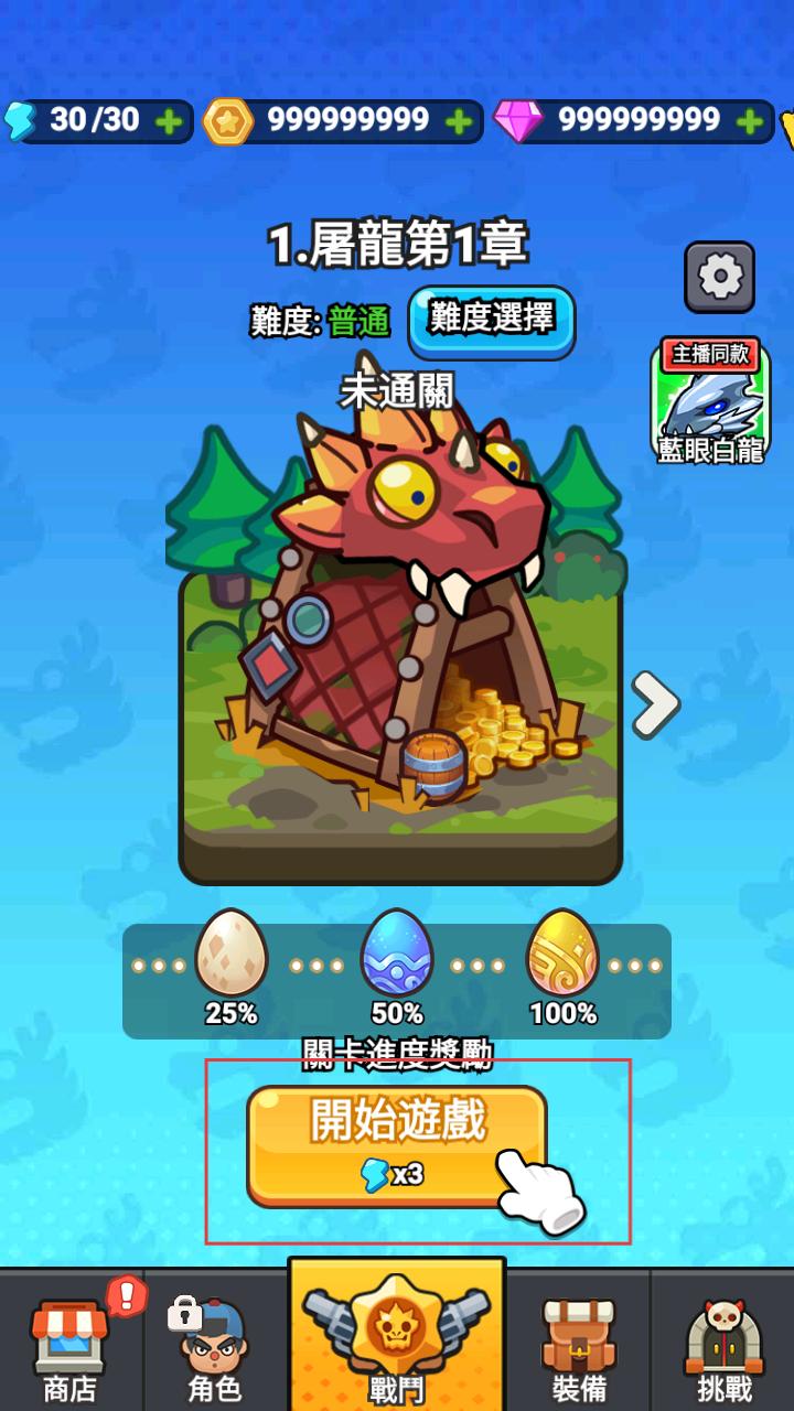 1、点击开始游戏,进入屠龙第1章的冒险,选择普通难度,开启与巨龙的战斗挑战,踏上屠龙之旅。