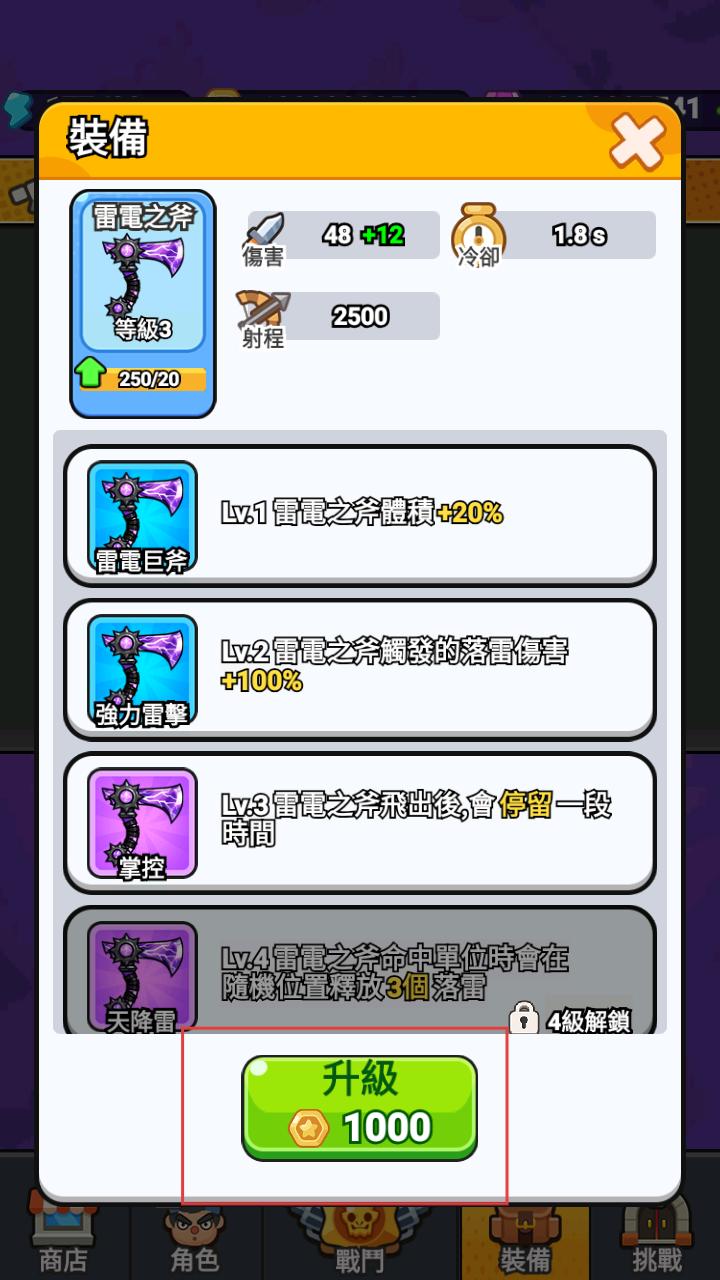 2、进入装备升级界面,花费金币升级雷电之斧等装备,提升伤害、冷却等属性,增强装备战力,助力屠龙冒险。