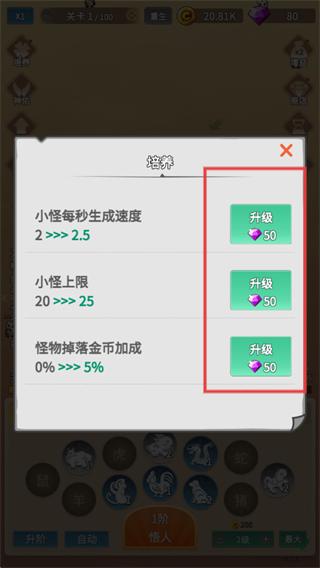 3、进入培养界面,消耗50钻石可升级小怪生成速度、上限及怪物掉落金币加成,提升资源获取效率,让挂机收益更丰厚。