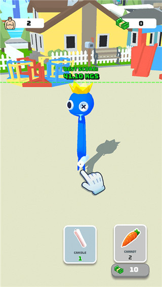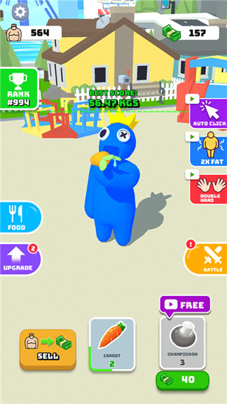 1、操控彩虹小人在城市场景自由冒险,,通过不断的吃食物从而增加体重更好的赚取钞票。