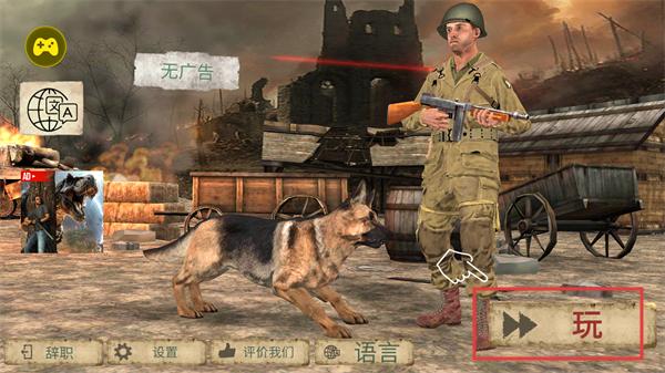 1、进入游戏界面,看到士兵与军犬搭档的场景,点击玩按钮,开启以第二次世界大战为背景的射击任务之旅,化身特种部队突击队员执行秘密任务。