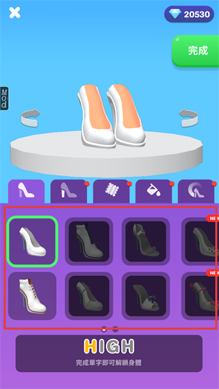 1、在鞋子选择界面,可挑选不同款式的高跟鞋,完成选择后点击完成,为跑酷准备专属鞋子,开启时尚跑酷。