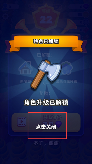 1、点击关闭按钮,关闭特色已解锁的提示界面,回到游戏主操作场景继续进行资源采集。