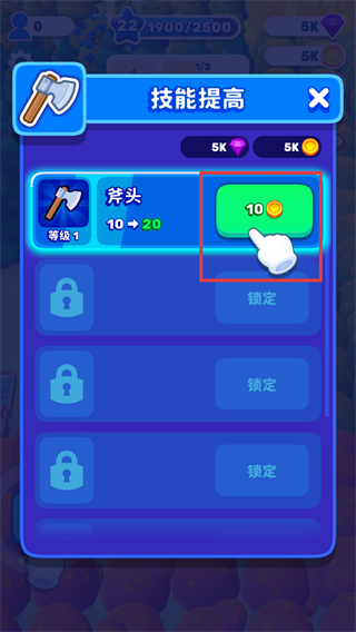 2、点击斧头技能旁的提升按钮,消耗对应金币将斧头等级从10提升至20,增强伐木效率。