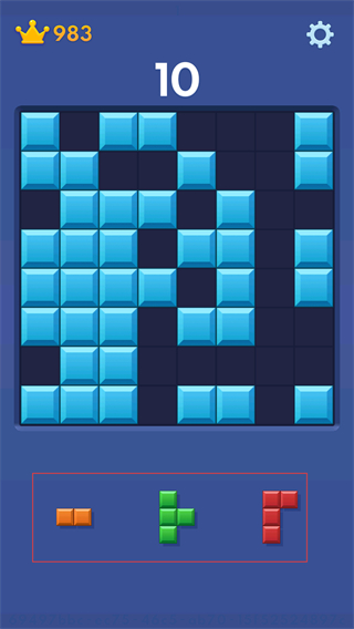 1、方块组合采用动态随机序列提供。每次出现的三种方块形状固定,但排序随机,玩家必须依据当前组合即时规划最有效的放置位置,无法依赖固定套路。