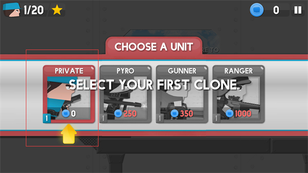 1、在选择单位界面点击PRIVATE选项,选定你的第一个克隆兵,该单位所需资源为0,可直接进行后续操作。