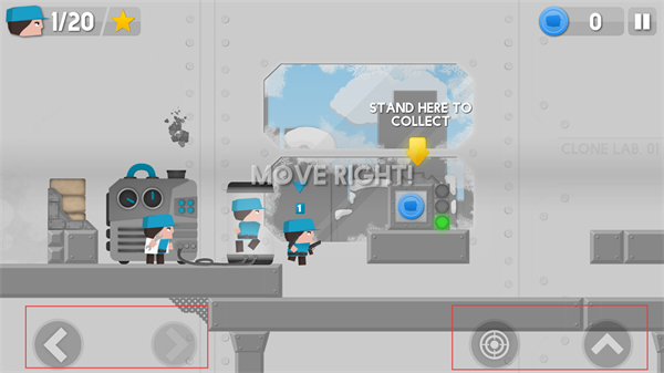 3、操控方向按钮让克隆兵向右移动,按照提示站到指定位置,触发收集动作,推进游戏流程。