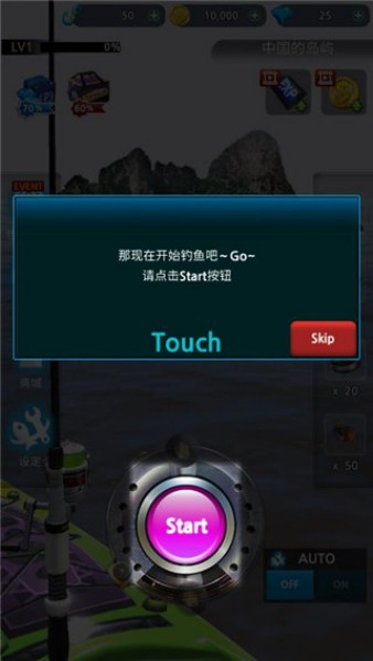 1、进入主界面点击“Start”开启钓鱼,右侧查看已装备渔具,左侧可切换世界地图、商城等功能区。