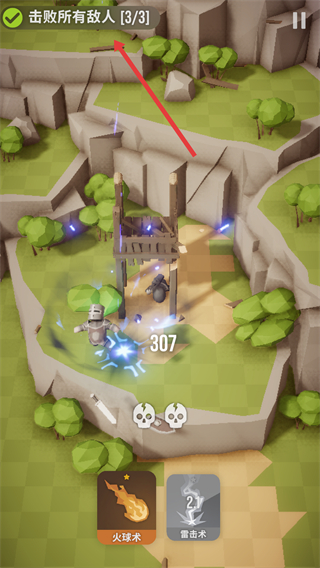 1、使用雷击术攻击剩余敌人,敌人被命中后显示伤害数值307,战斗完成后场景呈现已击败所有敌人的状态。
