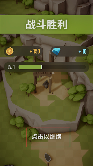 2、战斗胜利后界面显示获得150金币与10钻石,等级进度条更新,点击以继续按钮可进入后续流程。
