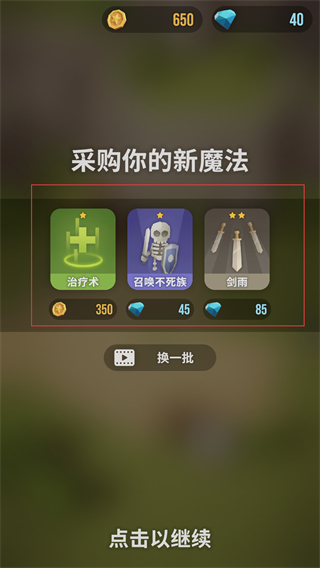 3、进入采购新魔法界面,可选择治疗术召唤不死族剑雨等魔法,对应消耗金币或钻石来获取新技能。