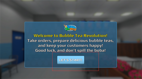 2、点击LETS START按钮,确认游戏引导提示,准备开始接收顾客订单,制作珍珠奶茶满足顾客需求。