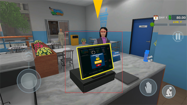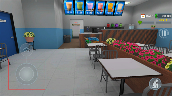 3、滑动左侧的控制按钮,操控角色在店铺内移动,前往不同区域,为接待顾客、制作饮品做准备。