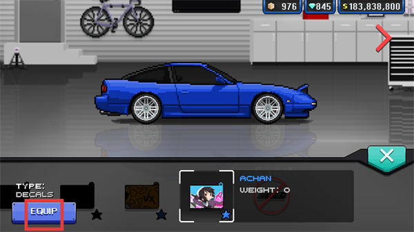 3、在改装界面选择ACHAN装饰道具,点击EQUIP按钮,将该装饰应用到赛车上,改变赛车外观。